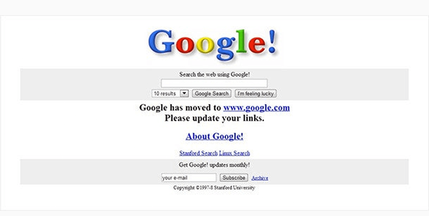 1998 UI: The early version of Google’s search page was cluttered, with a bunch of links, buttons, and options to choose from. It gave users too many choices and was far from streamlined.
