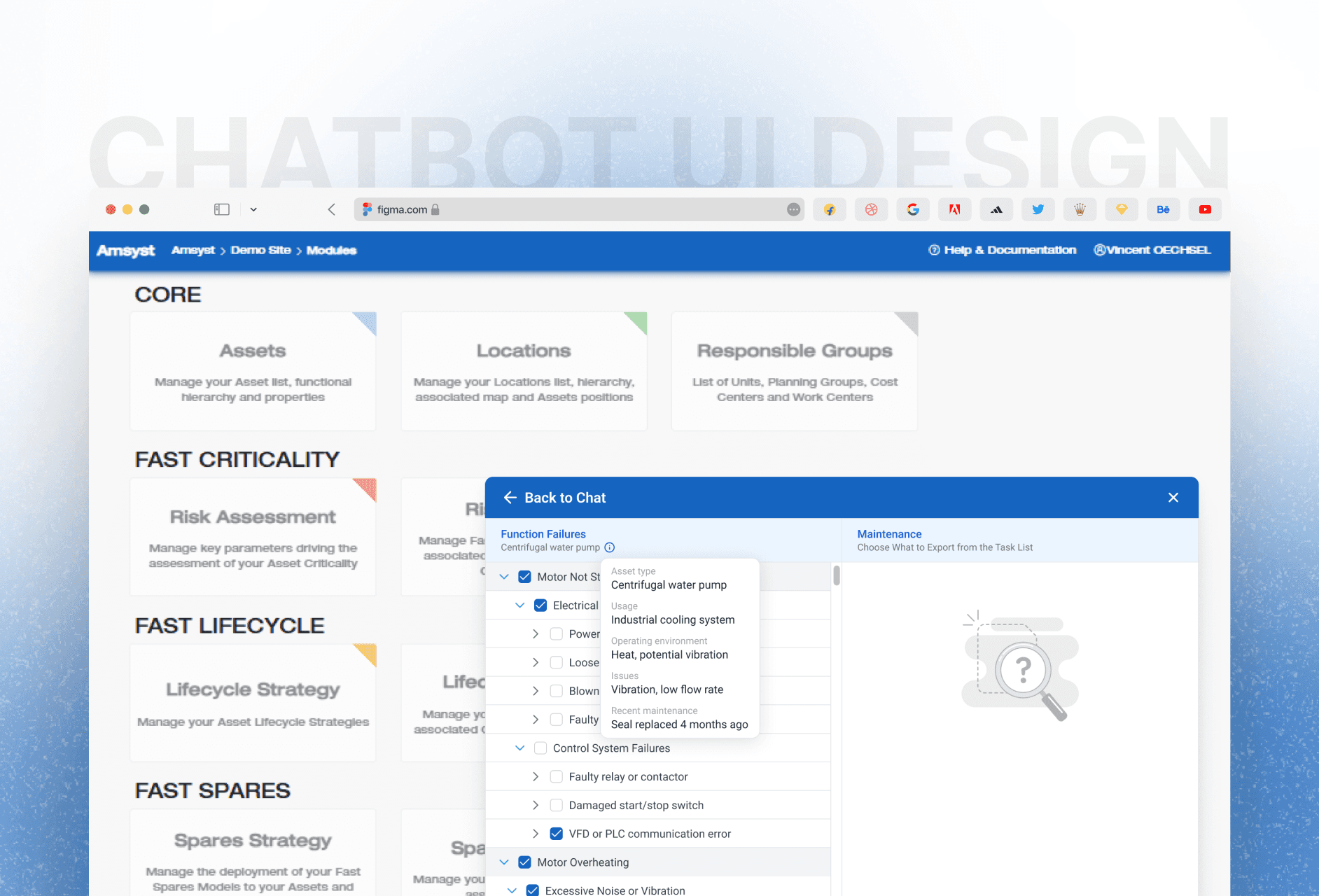 Designed a chatbot that helps technicians identify asset failures and export the right maintenance tasks quickly.