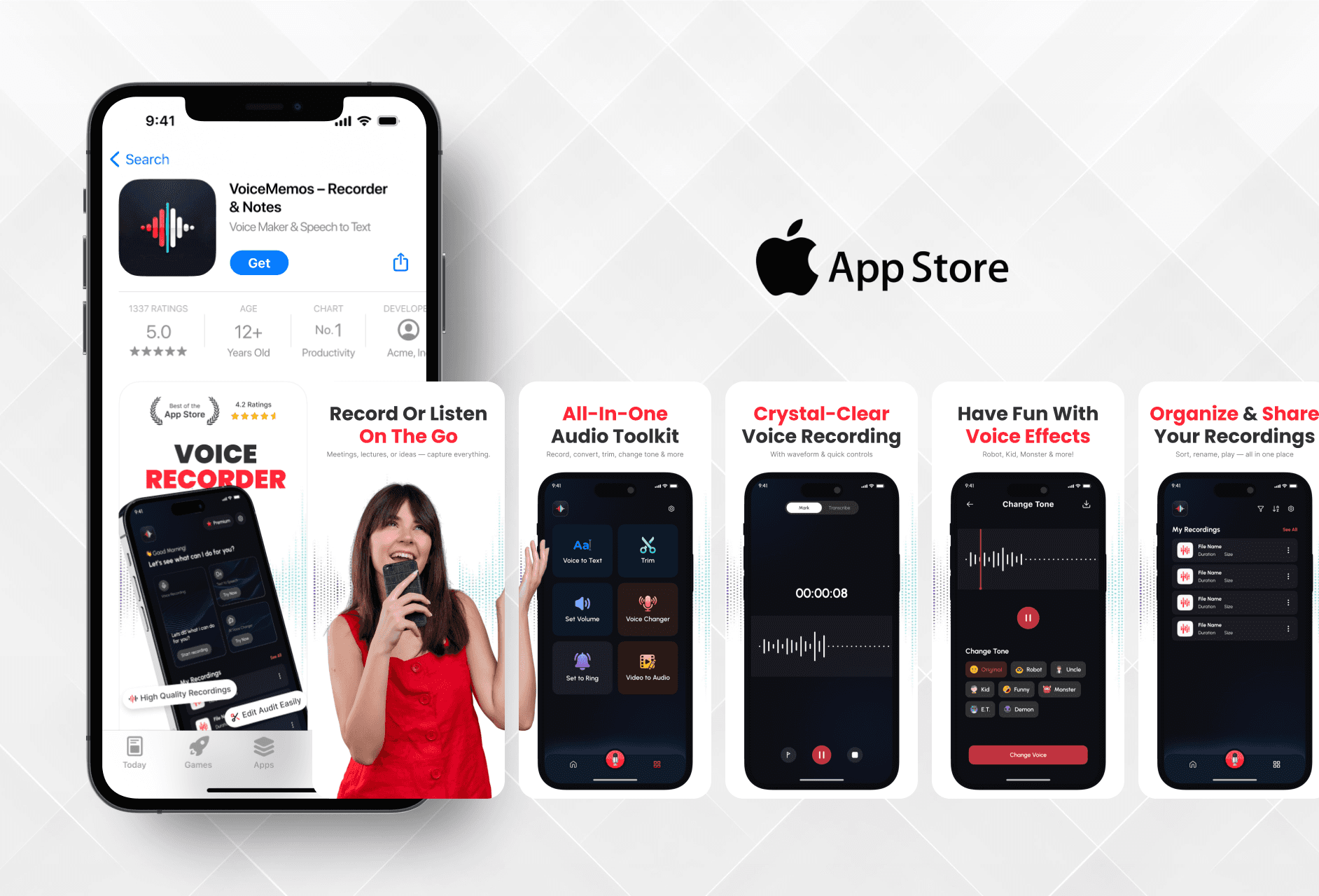 Designed a clean icon and engaging screenshots for VoiceMemos to help users quickly understand its purpose and boost downloads.