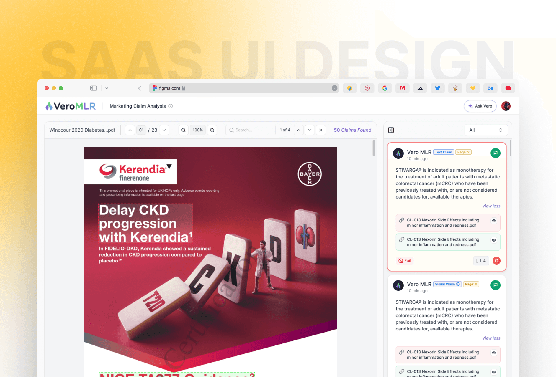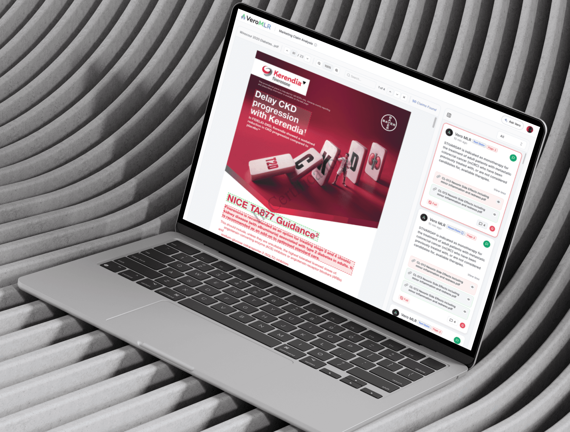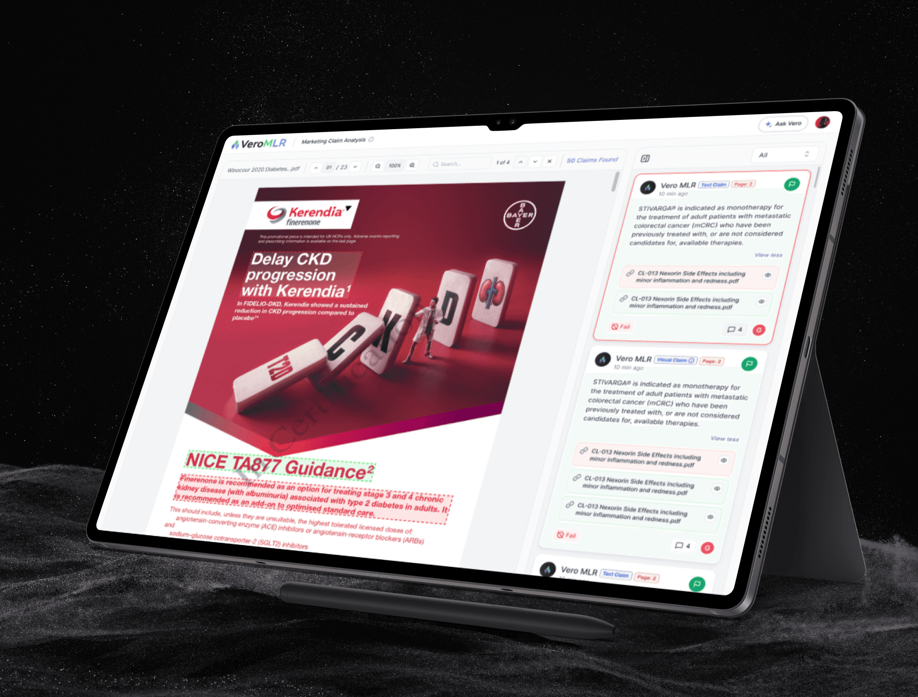 Vero MLR is a pharma review platform where marketing claims are checked against scientific references. It helps teams review AI-detected claims using text, charts, or images, and finalize them with human verification. This design supports end-to-end review from task creation to final approval.
