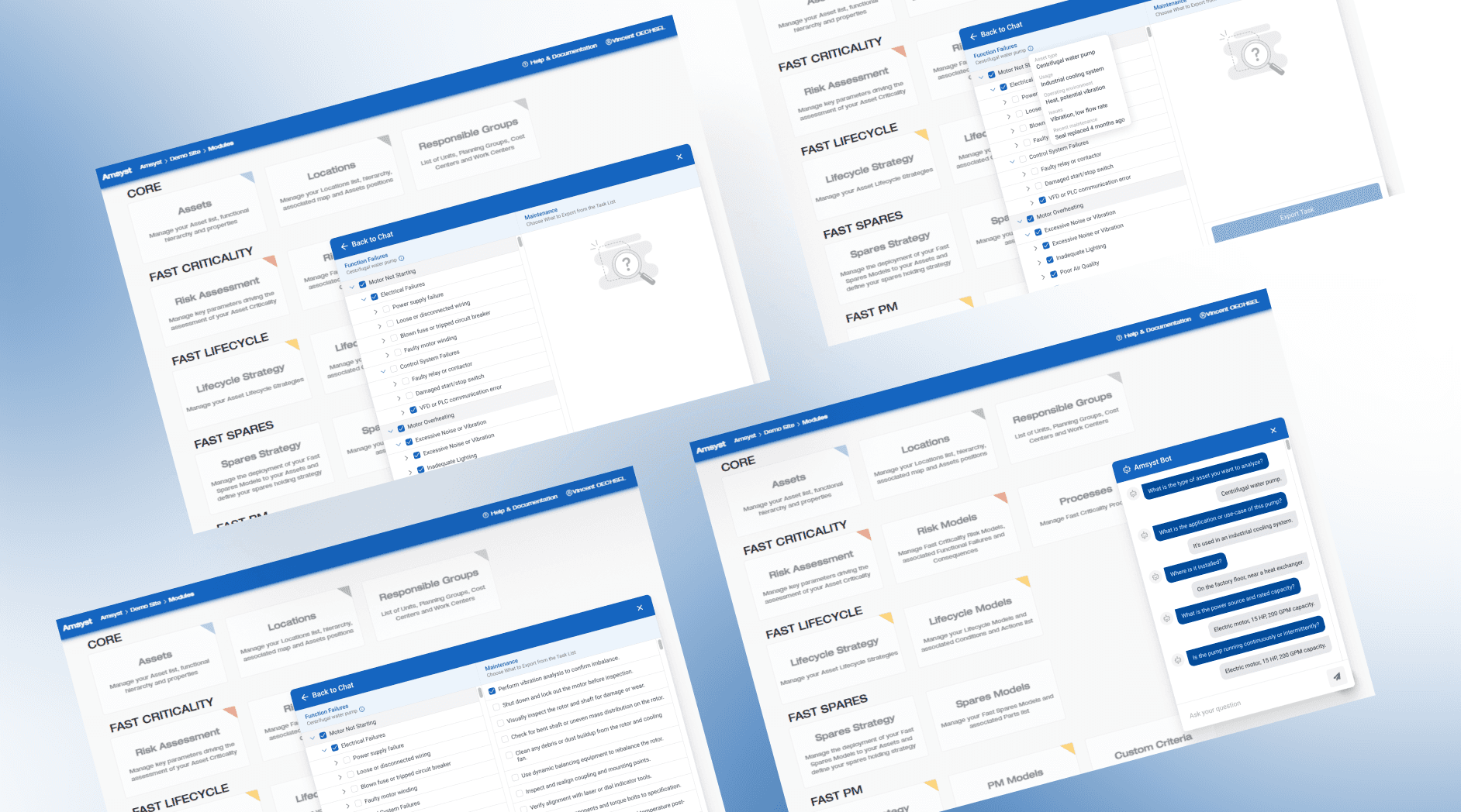 Amsyst is an asset management platform used in factories to track equipment and plan maintenance. Earlier, users had to search through long lists to find the right failure and task details, which was slow and confusing. I designed a guided chatbot that asks simple questions and shows only the relevant failures and maintenance steps, making the process faster and easier to follow.