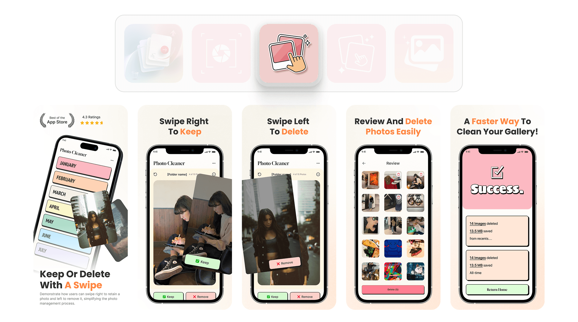 This app helps users clean unwanted photos by swiping through them quickly. The challenge was to explain that flow visually within just a few screens. I used the real UI and actions inside the app to guide the design. The color choices and layouts were kept light and distraction-free to let the function stand out. The goal was to make people understand at a glance how easy it is to use, without needing to read too much or guess.