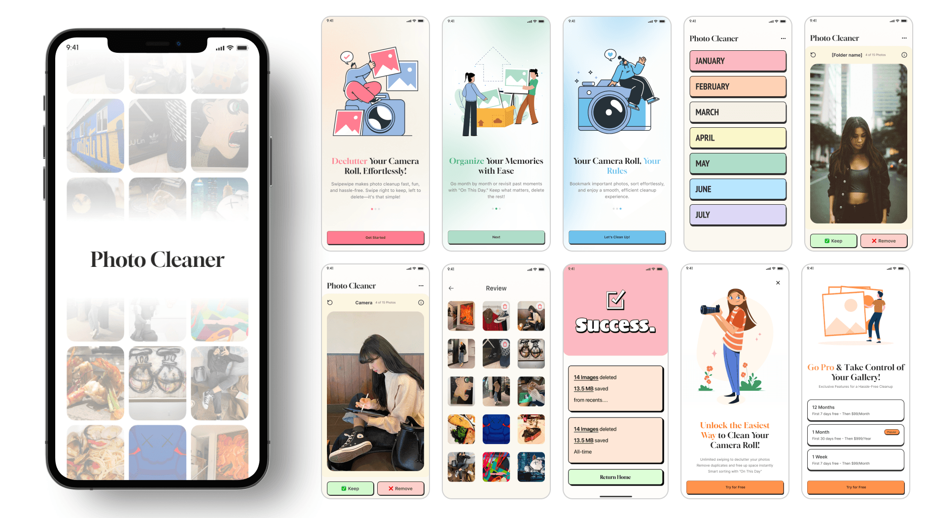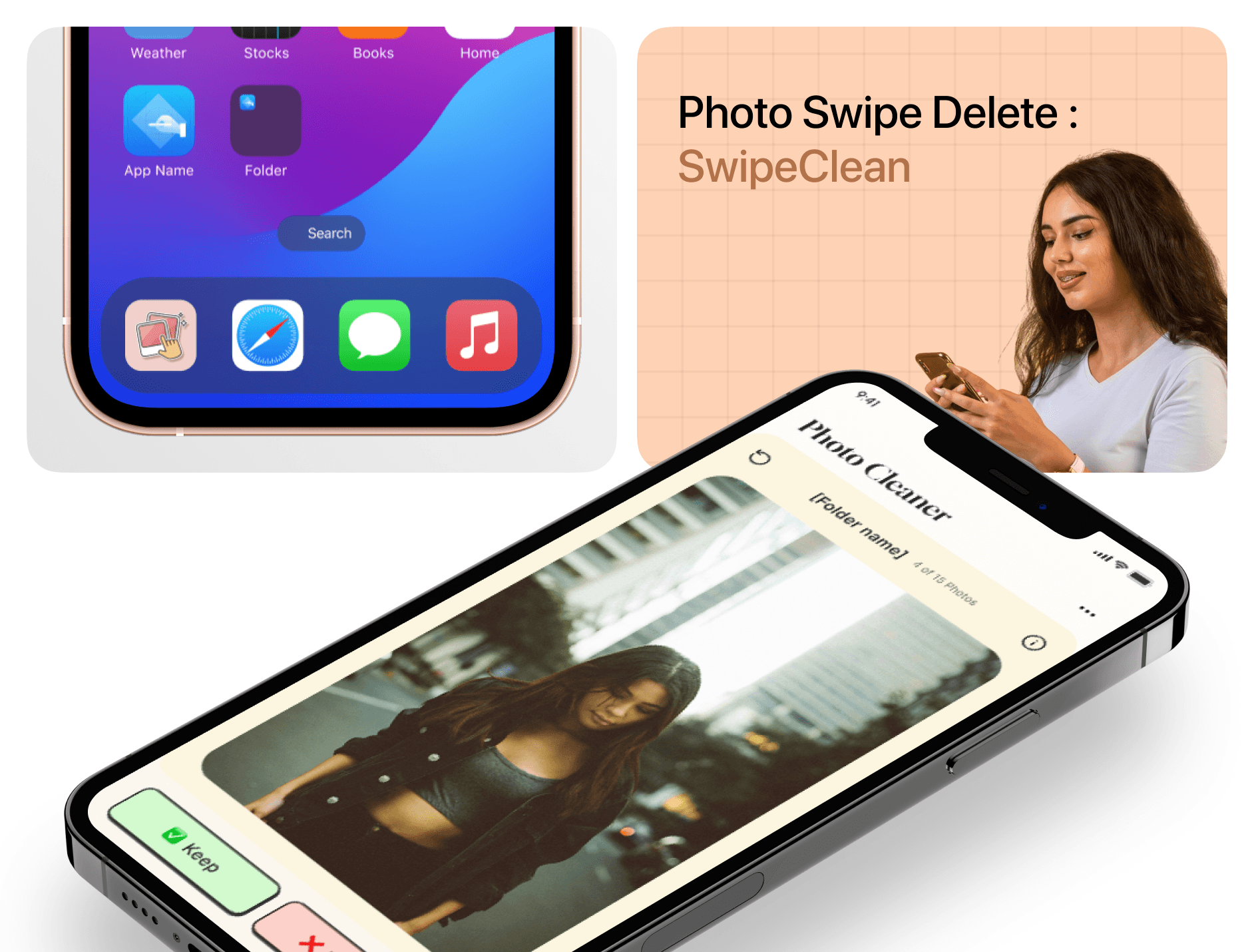 To make the app approachable, I selected a simple color palette and clear typography. Interactive elements like swipe gestures were implemented to allow users to quickly decide which photos to keep or delete.
