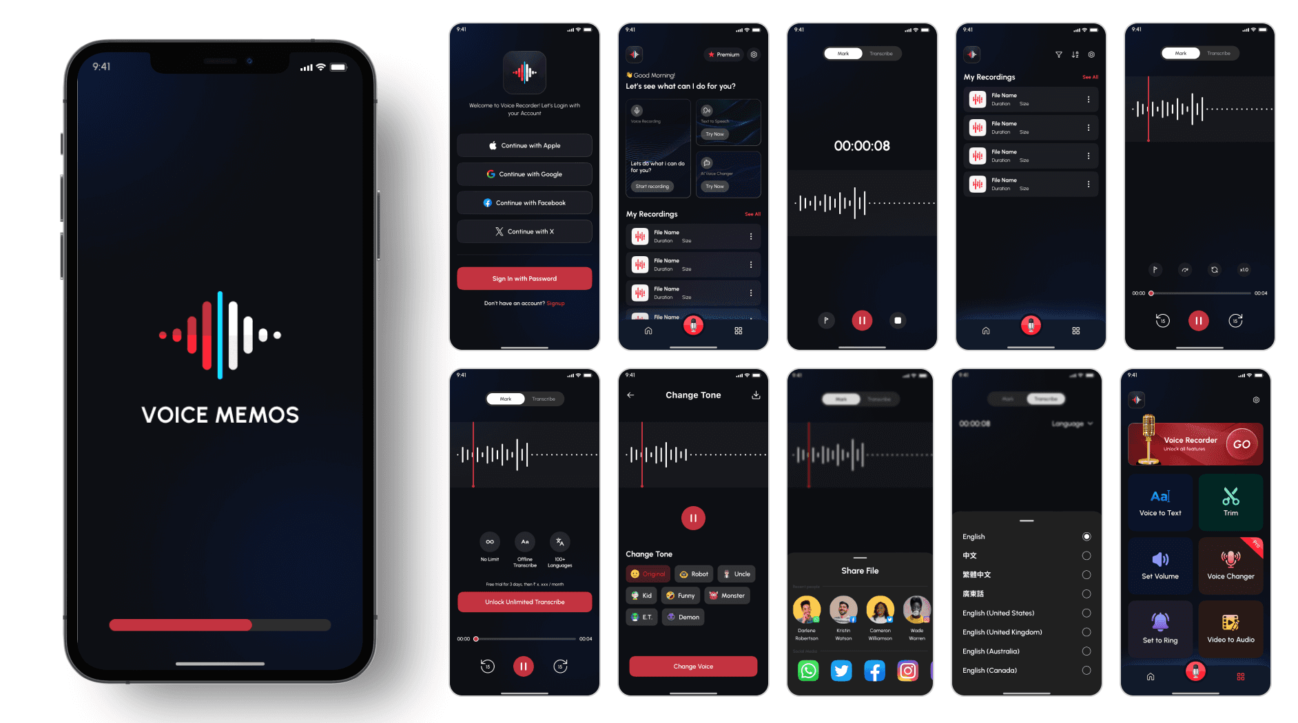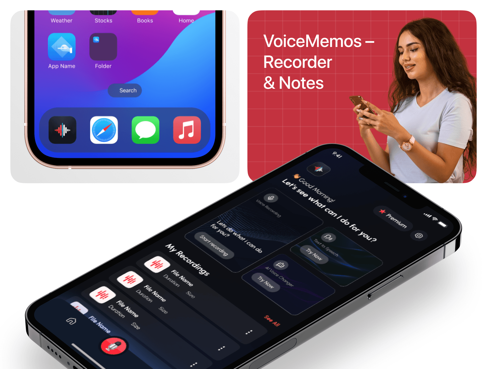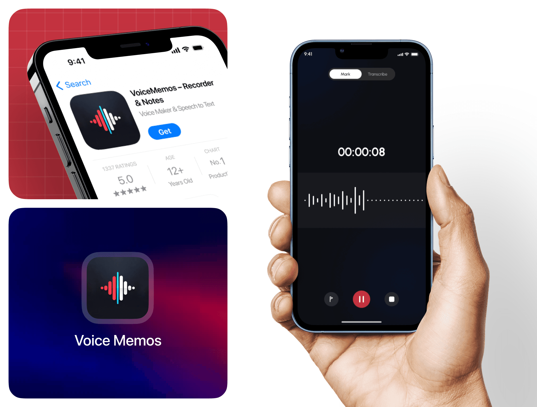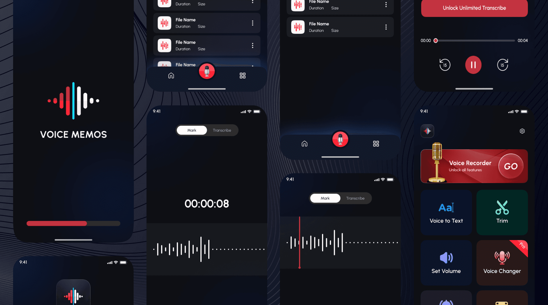 VoiceMemos – Recorder & Notes is an iOS app that allows users to record voice memos, transcribe them into text, and organize their notes efficiently. I was responsible for designing the complete UI/UX and App Store visuals from the ground up using Figma.